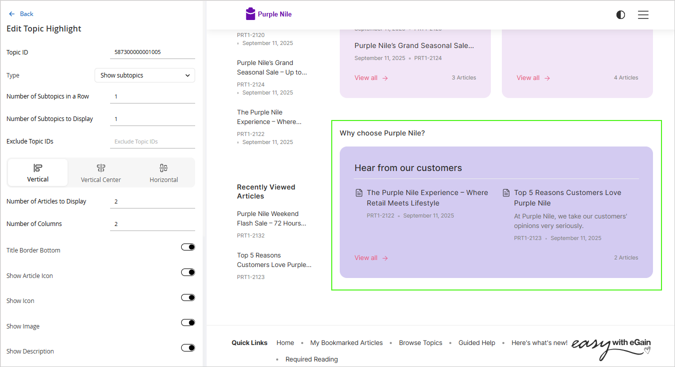 - Number of Articles to Display: Provide the number of article titles that you want to display in the Topic Tile. This setting is only available for the Vertical layout.